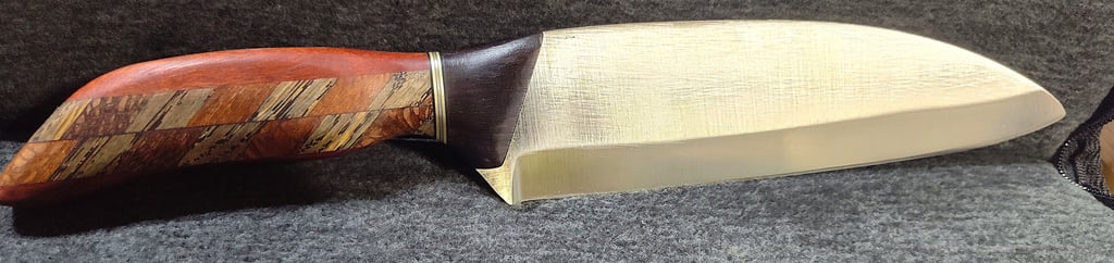 The handle showcases intricate craftsmanship, featuring individually hand-sanded blocks of Olive wood and Marble wood forming the arrows. The top corners are crafted from rich American Walnut, while the front and back bolsters are made from exquisite Bocote wood. The front bolster is intentionally lowered to safeguard the hand from the blade edge, ensuring both safety and functionality. Adding a striking detail, the rear of the handle includes an inlay of African Blood-Wood.