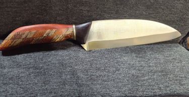These knives are the same quality as my expensive artisanal kitchen knives. The difference is that the handles are simpler and take about 12-18 hours less work to make and install. This particular knife has an imported Moroccan thuya burl handle with decorative pins. The name was laser etched for its owner.
