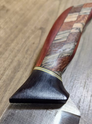 "My intrepid knife design features a stunning raindrop-pattern inlay crafted from Aged American Oak and exotic Lacewood, creating a rich and sophisticated aesthetic. The front bolster is made from exquisite Bocote, while the rear bolster showcases an angular cut of Lacewood, adding both contrast and character. The blade is finished with my signature 'Rain Drop' treatment—an exclusive, uniquely textured finish that combines durability with refined style."